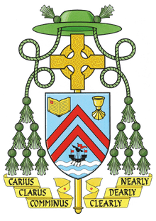 The Celtic Cross of my Mother’s (Henry) Family supports the Shield that bears the red chevrons of the Laurenson Family. The Barque refers to both that of Peter and those of my ancestors who arrived here, the first setting foot from HMS Adventure in 1776 rides on The Waters of the Diocese - Holy Water, rivers, lakes and seas. Our life is sustained by Word and Sacrament, transmitting the life of Christ.
